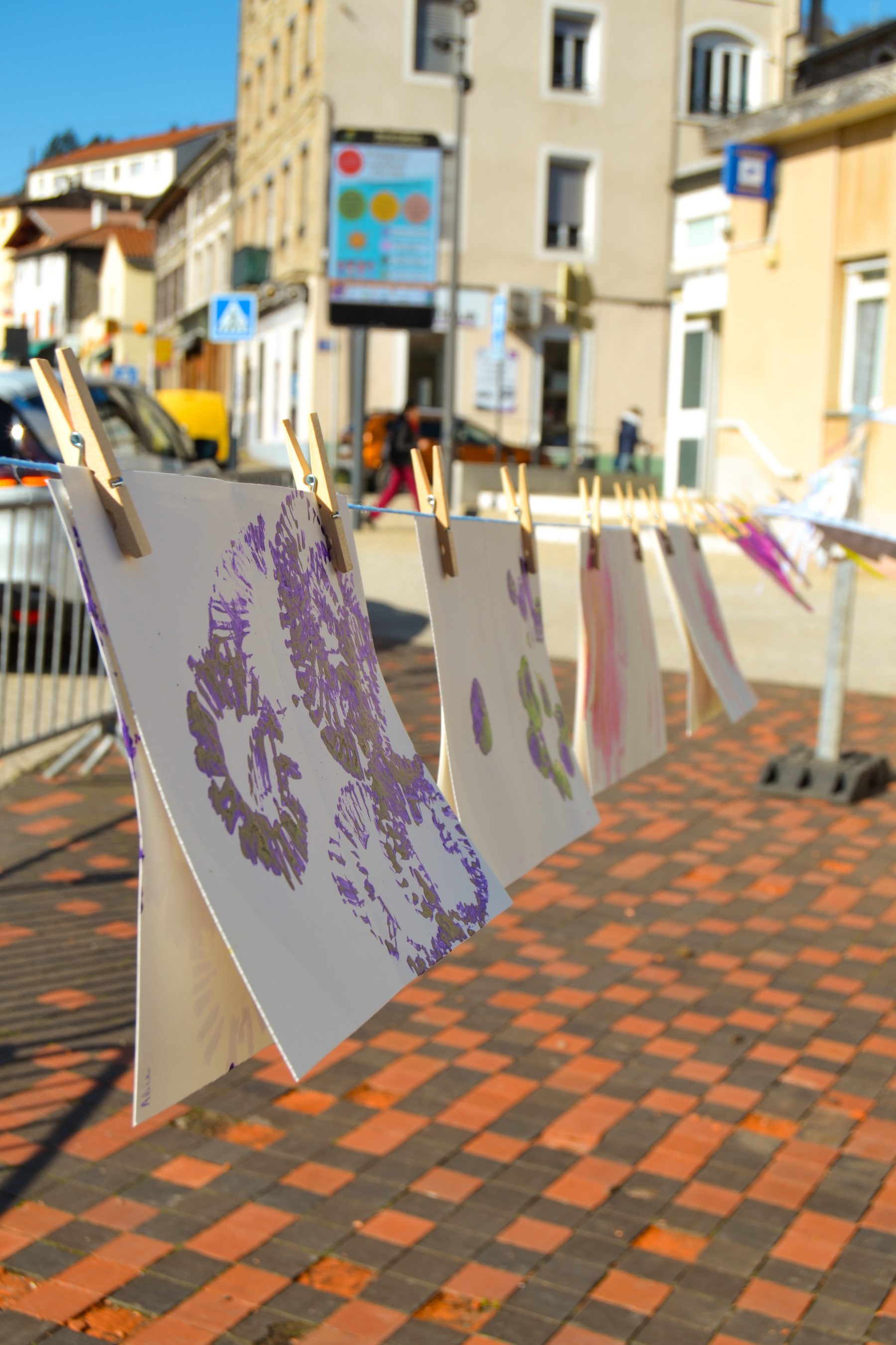 Dessins, peintures et compositions variées ont été suspendus sur des fils, offrant aux passants une exposition originale et accessible à tous.