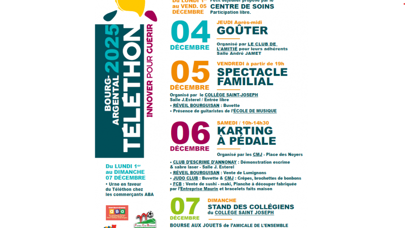 Animations au profit du téléthon : karting à pédale organisé par le Conseil Municipal des Jeunes, démonstration d'escrime et sabre laser, vente de luminions, de sushi / maki... Et de nombreuses autres animations du 1er au 07 décembre.